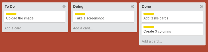 Example of a simple Scrum board, giving an immediate photography of the progression of tasks (here using Trello).
